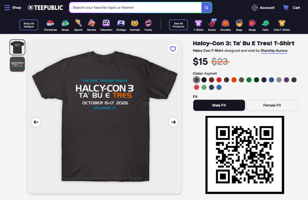 Everyone loves merch, and you can visit the Starship Aurora merch site on TeePublic NOW to get the first official Halcy-Con 3 T-shirt…and mugs…and tote bags…the options are almost endless. Show off your Starcruiser Superfandom!