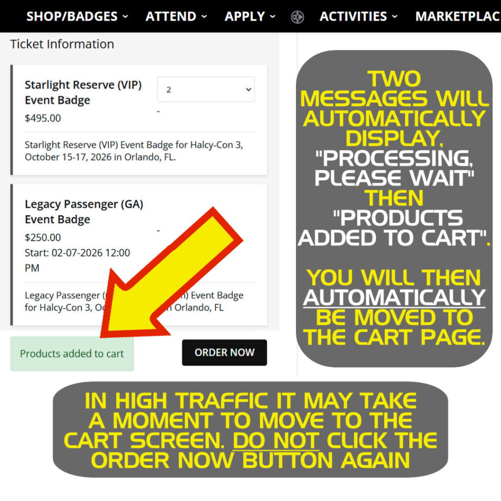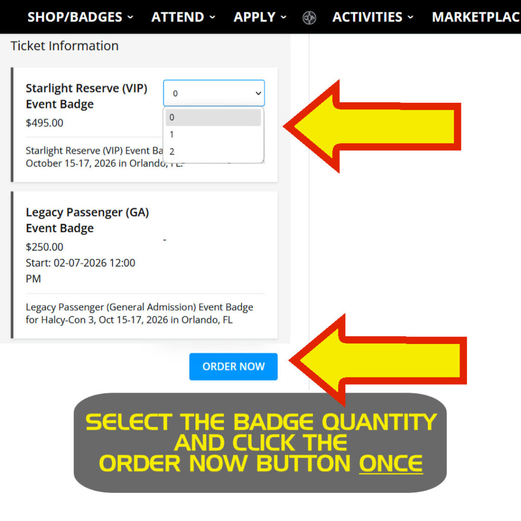 • We anticipate high demand for badges at the times of their release. We appreciate your patience in these high-demand/traffic times! Tip: click the “Order Now” button only ONCE after selecting badge type/quantity. Clicking this button multiple times may slow cart response times and/or result in duplicate purchases.