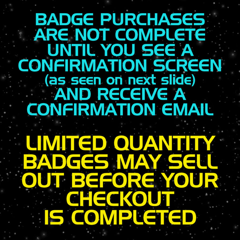 • Badges are LIMITED and may sell out at any time. Badge purchases are not completed until you see the confirmation screen and receive the confirmation email with badge pickup QR code(s).